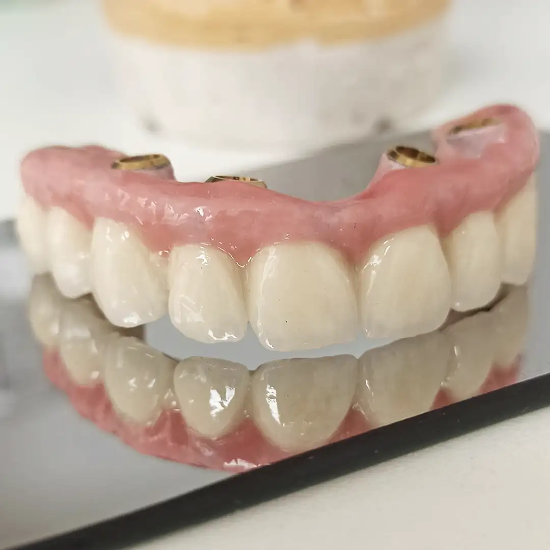 На прийом звернувся пацієнт з повною втратою зубів на верхній щелепі. Після детального обстеження було виявлено значну втрату кісткової тканини в ділянці бокових зубів та супутнє захворювання цукровий діабет. Альтернативним способом вирішення проблеми була імплантація All on 4 . Під час втручання були відзняті відбитки та через 2 дні встановлена тимчасова конструкція. Після періоду остеоінтеграції тимчасову конструкцію було замінено на постійну на балковій опорі.